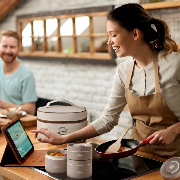 Vychutnejte si teplé domácí jídlo, ať jste kdekoli, s touto sadou vícevrstvých nádob na jídlo.