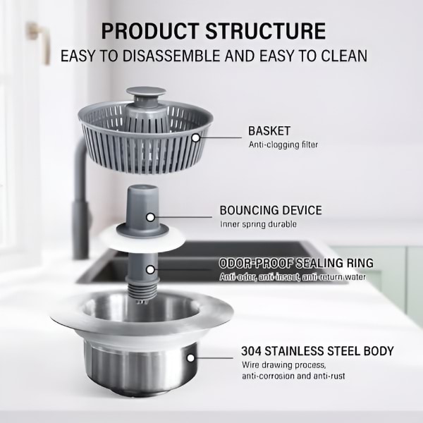 Toto řešení „vše v jednom“ funguje jako sítko, zátka a pachový filtr – udržuje váš dřez čistý, suchý a bez zápachu.